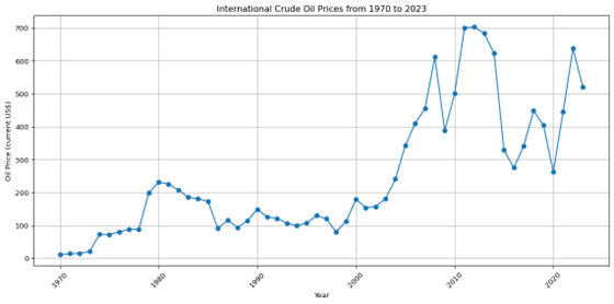 Crude Oil Prices from 1970 to 2023')