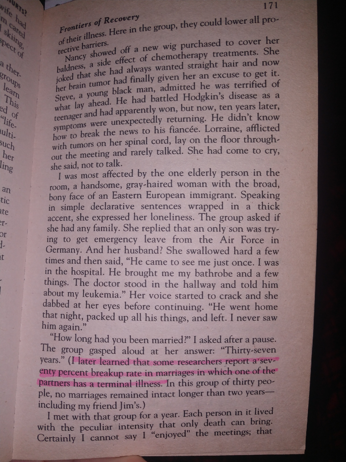 The book, Where Is God When It Hurts?, was first published decades ago so the statistics are old, but knowing the human heart I don’t suspect they’ve changed... 70% of marriages where one partner is diagnosed with a terminal illness result in divorce. The healthy partner just leaves.